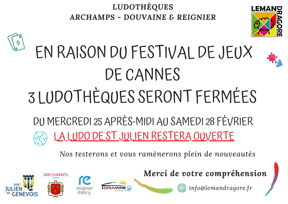 Attention : trois de nos quatre ludothèques seront fermeés du mercredi 25 février (après-midi) au samedi 28; la ludothèque de Saint-Julien-en-Genevois restera ouverte.